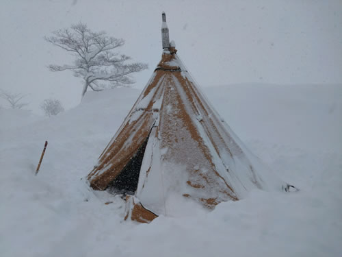 I've finished setting up the tent. It's been snowing a lot, 12 inches since we arrived. There's almost 7 feet of snow. I love being comfortable in this harsh wilderness with my equipment and ingenuity.
