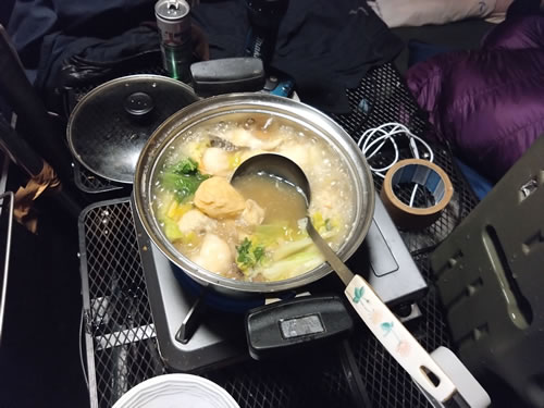 Second day of camping in the snow. Two feet of snow fell overnight. It took an hour to clear the snow from around the tent. I have plenty of fuel (firewood, oil, gas) so I'll be warm and having fun.The hot pot dinner in the evening was delicious.