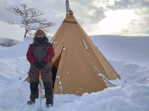 雪中キャンプ2日目、夕べは雪が60cm降って、テントの除雪に1時間掛かってしまいました。