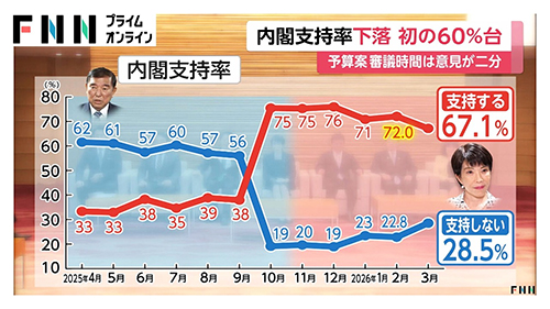 高市内閣支持率 不支持が5.7ポイント上がり 初の6割台に