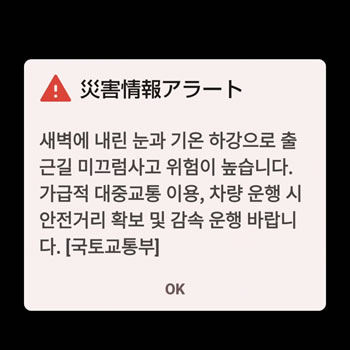 慌てて翻訳アプリで調べたら雪で路面が凍ってるから気をつけるようにって それってアラート必要?日本ではないアラートでした。