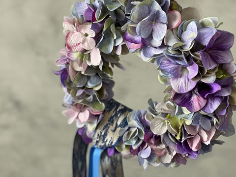 何ともいえないアンティークな色のグラデーションの紫陽花をベースに、バラの花が散りばめてある、美しいリースであった。