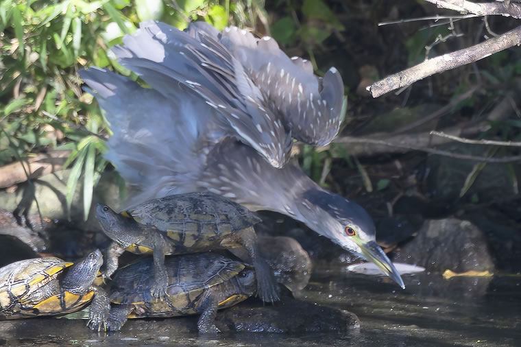 アオサギが獲物を狙っているその前にはカメが連なっていました。