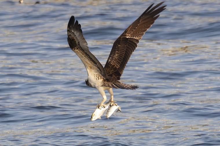 水面から飛び出すと、両足に獲物を掴んでいました。見事なダブルゲットです。
