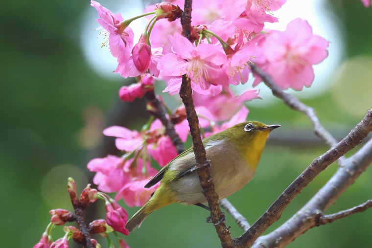 横浜緋桜の花の蜜を吸いにメジロがやってきます。