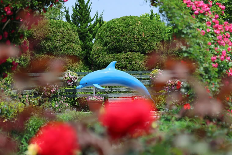 バラ園の入口近くのイルカさんの水色が、バラ園の赤とのコントラストで目に留まります。