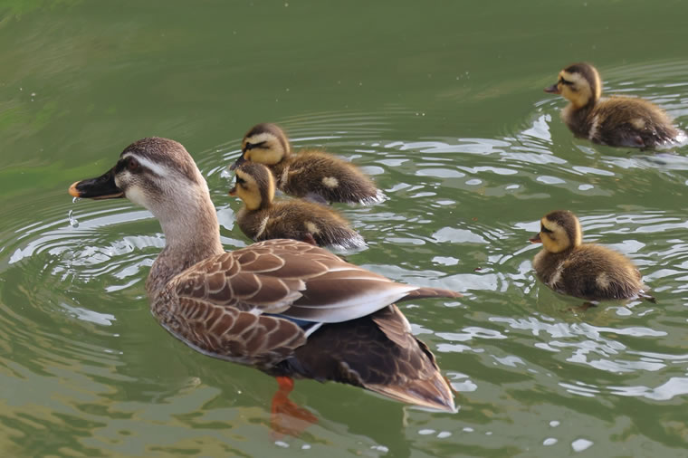 今シーズン初のカモガモファミリーはヒナが4羽でした。
