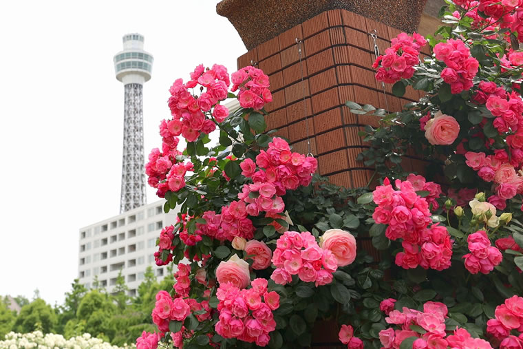 薔薇とレンガの赤が、マリンタワーを惹き立ててくれます。