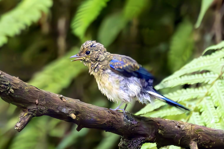 成鳥のオスは、全身がコバルトブルーですが(VOL.318参照)、若オスは体の一部が青です。