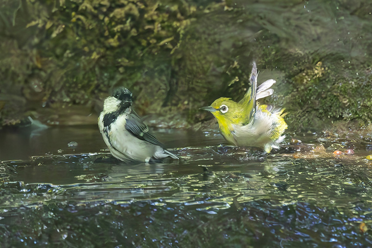 公園の奥で、湧水が岩の窪みに溜まっているスポットに到着すると、シジュウカラが水浴びしていました。