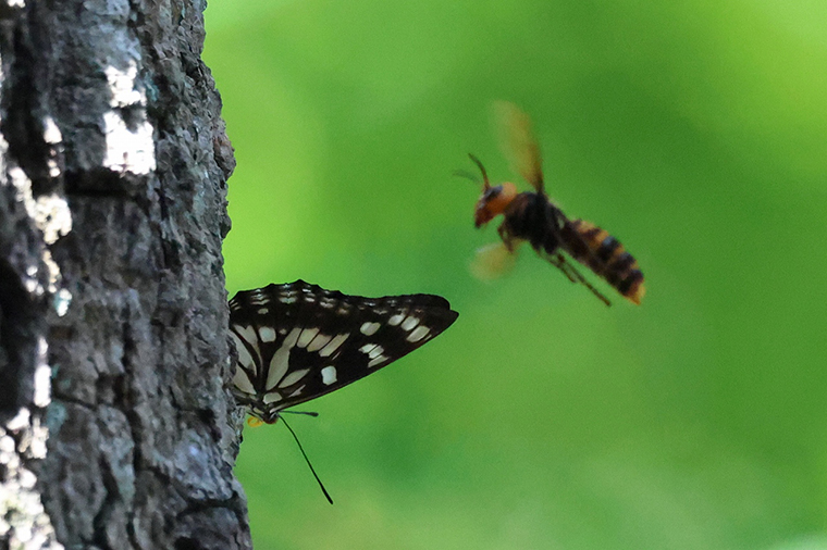 この水場の上の方で何かが動いていたので、翌みたら、蝶とスズメバチでした。