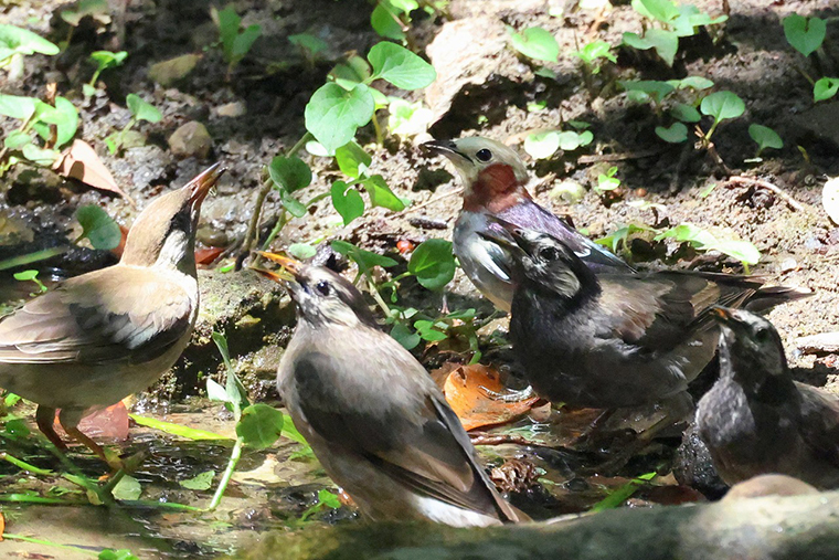 ムクドリに混じってのコムクドリ(右奥)の水浴びです。