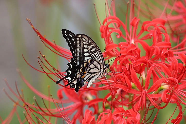 彼岸花の朱色にアゲハチョウが映えます。