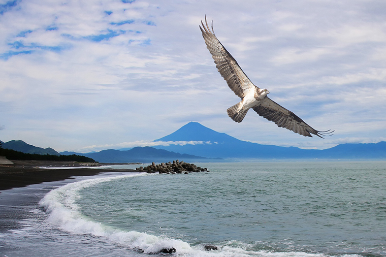 最初の二つをイメージして、三保の松原で撮った写真とミサゴの写真を合成してました。