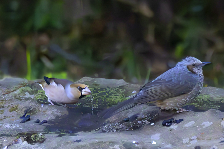 石の窪みに溜まった水を飲みに鳥たちが集まります、左がシメ、右がヒヨドリです。