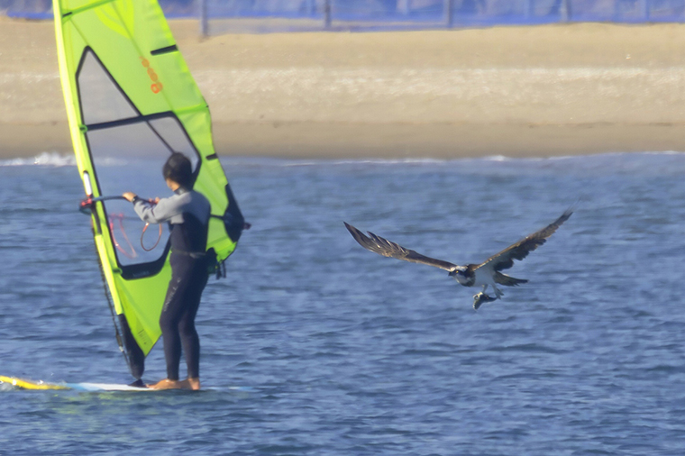 ゲットした魚を抱えて水面近くを移動していくと、ウィンドサーファーの背後を通過していきました、