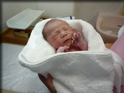 予定日が過ぎ、胎盤機能が低下し、赤ちゃんの頚部に1回の臍帯巻絡もあり、容易に分娩進行せず、入院5日目、ようやく陣痛発来して、無事出産しました。