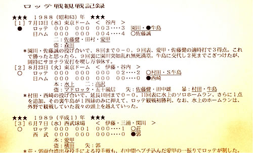 球場は東京ドーム(対日ハム戦)、西武球場(対西武戦、ドームになる前)、千葉マリン(本拠地)。