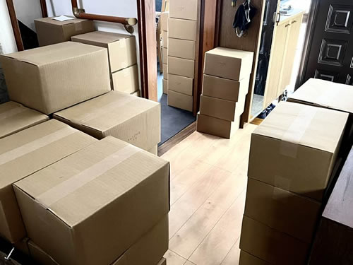 喜んだ直後には、収納の難問が...。家の中にひとまとまりで置ける予備スペースはないから、ちょっとした隙間も埋めるように、廊下にも階段にも置いてみた。