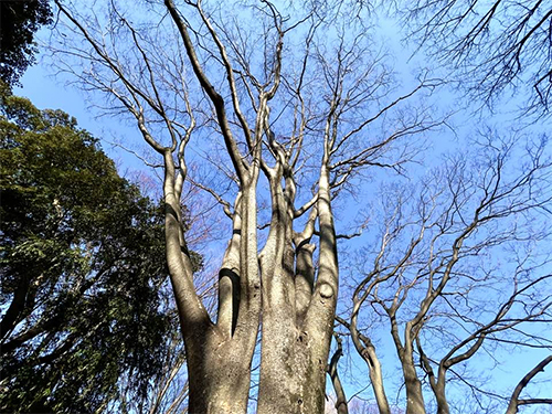 葉が落ちて青空に伸び上がる枝のラインが見え、生命感を感じさせる。この光景に完成作品を重ねてイメージしてみる。