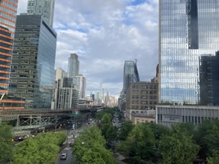 車内から撮ったQueensboro Plaza駅。 遠くにマンハッタン島の高層ビル群が見える。