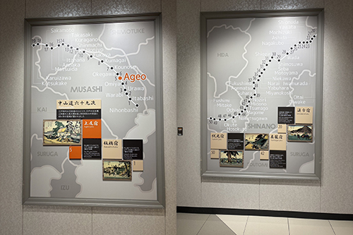 モールの壁に中山道六十九次の掲示があり、普段は見過ごしていたのをじっくり見てみると・・・ 「江戸時代の五街道のひとつで江戸の日本橋と京都の三条大橋を結ぶ約540kmの街道に69ヶ所の宿場があり、上尾宿は日本橋から数えて5番目の宿場。 日本橋から出て最初に泊まる宿場として、小さな宿場にもかかわらず、本陣1軒、脇本陣3軒、旅籠41軒と旅籠が多かった。 しかし、安政7年(1860年)の大火で宿場の遺構は残ってない」 けっこう昔は栄えていたのかな・・・