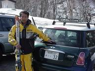 【2005.04.10】 来シーズンに向けて、天元台高原(山形)にマテリアルチェックに来ています。 今まで、鋼のような固い板を使っていたのですが、よる年波には勝てず、来季より、紙のように柔らかい板を使うつもりです。 感覚がどう変るかと、確認に来たところです。 そこで、記念撮影・・・・・・ 「すみませ〜ん!、シャッター押して頂けませんかぁ?」 益々、怪しいオヤジになって行く、今日この頃!