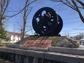 写真は、Storyスナップ「日中線しだれ桜並木の旅」から、喜多方プラザにあったSLの大車輪。明治百年を記念して磐越西線の開業を讃える市民オブジェが建立。 Storyスナップ「喜多方プラザの巻」