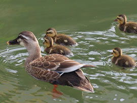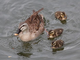 写真は、瞬間の魔術師T.sakumaの野鳥ギャラリー2より、今シーズン初めてのカルガモ親子。自宅前のふなだまり公園にて、コガモ4羽を引き連れた母鳥が泳いでいました。 野鳥ギャラリー2「カルガモ親子登場!!」