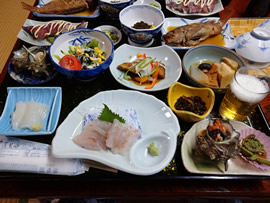 写真は、アッキーと仲間たち"僕たちの旅Ⅱ"から、発掘調査先で宿泊した宿の超豪華な晩飯。それもそのはず、この場所は海のど真ん中「飛島」。しかしある事件が!(笑)