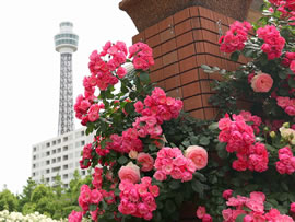 写真は、瞬間の魔術師T.sakumaの野鳥ギャラリー2より、マリンタワーを背景にした横浜ローズウィークのバラ。船が写った写真もあります。 野鳥ギャラリー2「横浜ローズウィーク」