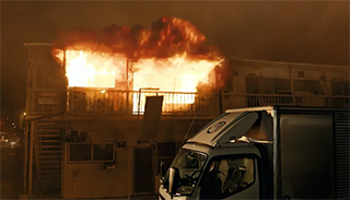 佐野親子が階段を降りてトラックへ戻ろうとしたその刹那、荷物を届けた部屋で爆発が起き、辺りは火の海に。