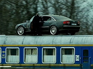 ラストは、ヴァレンティーナを奪って列車で逃走するならず者たちに対し、車から離れられないフランク(ジェイソン・ステイサム)は、橋の上から車ごと疾走する列車上にダイブ。(おいおい・・)