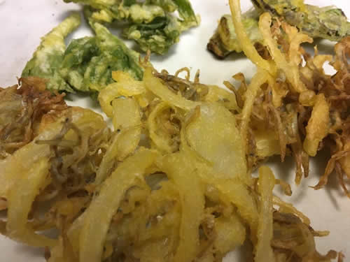 美味しい小女子がきたのでかき揚げに。アスパラとウドも天麩羅に。