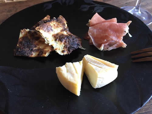 チーズ、生ハム。 八木 由紀子さんのお皿で。黒に黒の桐。大人な昼酒。