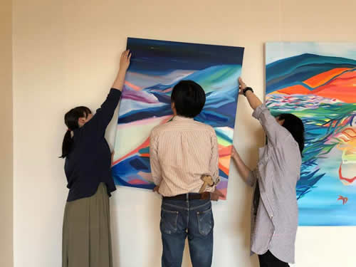 展覧会の設営中。