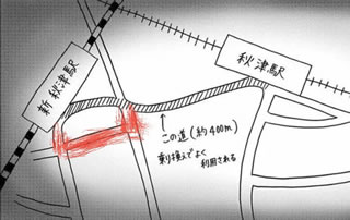 実はこのJR新秋津駅と西武池袋線秋津駅を結ぶ400mほどの乗り換えの道は歩いて6分ほどだが、いろいろと不思議なことが起こると言われている。