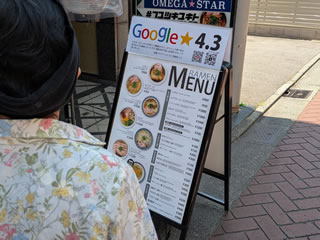 店の前には「MENU」の看板が。『Google ★4.3』とある。「食べログ」しか参照しないのでよく分からないが、Googleでは★4.3の評価を獲得しているようだ。(かなりの高評価!)