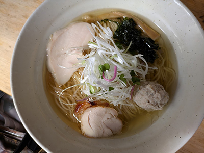 こちらは、鶏チャーシューと鶏つみれにメンマと岩海苔、そして白髪ネギが。
