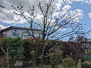 ◆ 7割ほどやった時点で、さすがに疲れたので庭の椅子に座って青空を見ながら一服。すると、あっという間に柿の木に若葉が。今年も美味しい実をたくさん付けておくれ!