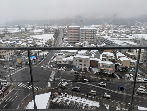 ビルの上には雪が積もり、遠く阿武隈山系は靄に霞んで見えません。