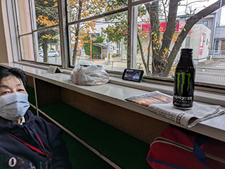 最初からそんなワケにはいかないので、我らは廊下の出窓の辺りに陣取り、飲み物や「大谷君」のYoutube番組を準備(笑)