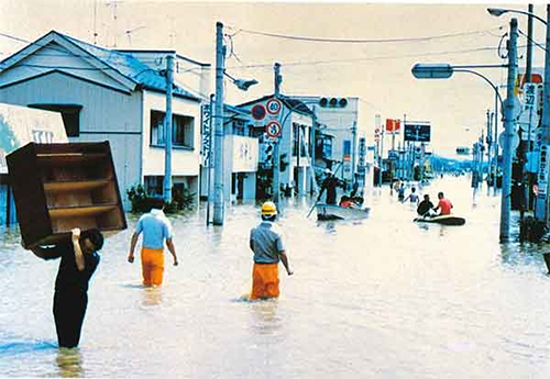 何と、道路があったはずのその場所は「一面の海」。小舟に乗って脱出している人たちが。