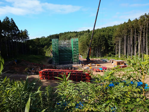 奥の看板が現7号線。更に奥の丘陵が現場。