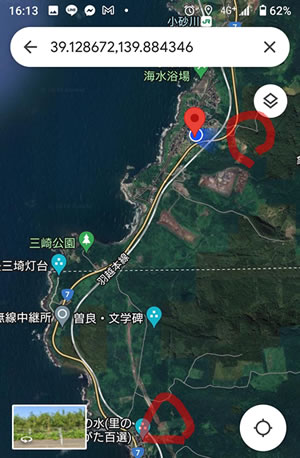 カウヤ遺跡と、赤丸が鳥海山麓の秋田と山形の山中の製塩遺跡