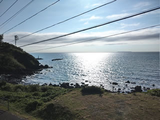 右奥が飛島。飛島は海浜で製塩作業。