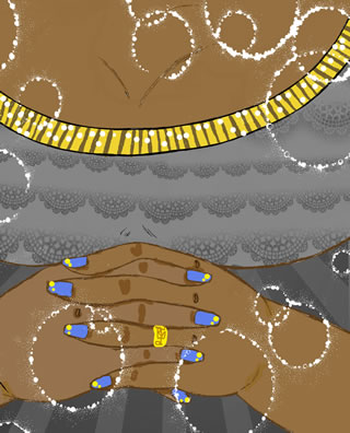 長身もある女性は、ふくよかさがはち切れんばかりの大きく肩のあいたグレイのシフォンが表面にあしらわれた、金のビーズの縁取りの光る様なドレス衣装を身にまとっていた。豊な胸がたわわにウエストの上に鎮座している。