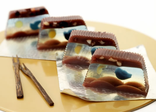 こちらはキューブ羊羹。色や中身のバリエーションが豊富で実に楽しい。大阪万博も成功するといいですね。(ま、日本人は必ず帳尻合せますけど。)