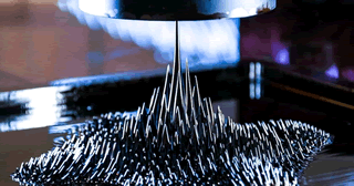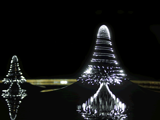 さて、その液体金属に磁性を付加し、流体アートを作ってしまおうという試みがなされています。どんなふうになるかと言えば、こんなふう・・