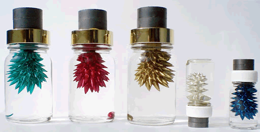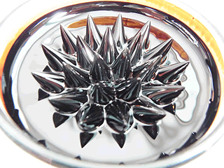 この金属の磁性流体は、マグネタイト(磁鉄鉱)やマンガン亜鉛フェライトなど強磁性微粒子の表面を界面活性剤で覆い、水や油のベースに溶かしこんだもの。